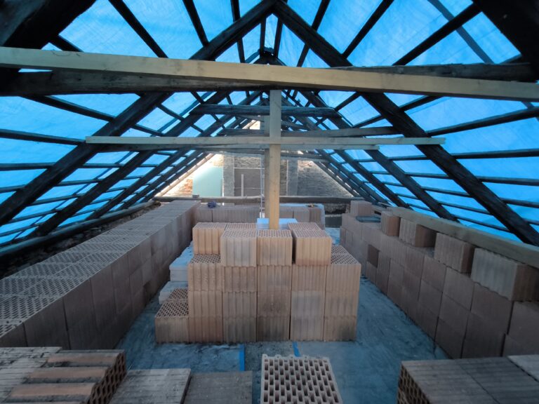 Tento týden: – Osazení interierových dveří vstupních 1np – sházení starého zdiva z podroví – podbetonování zdiva pro podkrovní přístavbu – odvoz 2 kontejnery střešní tašky a cihly – založení první řady tvárnic – zakrytí střechy plachtou – čištění dvora…