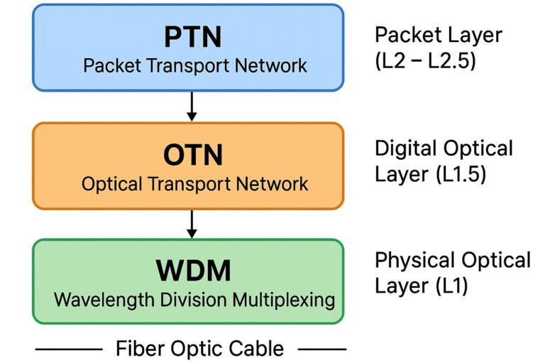 🧩 Overview Layer Technology Type Core Function Packet Layer (L2–L2.5) PTN Packet-based Efficiently transport and manage packet (Ethernet/IP/MPLS) traffic Digital Optical Layer (L1.5) OTN Digital frame-based Encapsulate client signals (Ethernet, SDH, Fibre Channel, etc.) into standardized optical containers Physical Optical…