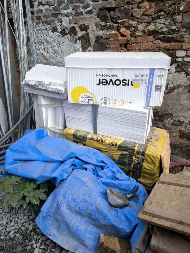 – vybourání zdi v podkroví pro navezení materiálu